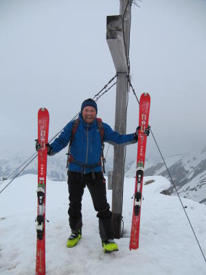 durchgehend tragende Schneedecke; leider hat die Front aus Norden den Hochtannberg schon ganz früh erreicht, und Sonnenschein war Fehlanzeige. In der Abfahrt oben deshalb etwas ruppig, aber sonst sehr schön zu fahren. Der Gipfelhang hat schon ein paar apere Stellen