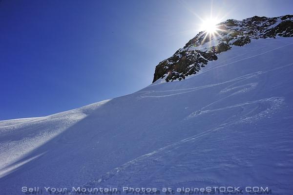 Perfekt. Schnee ab P Rosenlaui Gletscherschlucht, perfekt eingeschneiter Gletscherbruch, bester Trittfirn am Gipfelhang. Dort eine apere Felsstelle mit dem vom Sommer bekannten und beliebten abwärtsgeschichteten Fels. 2 Stangen sichtbar.