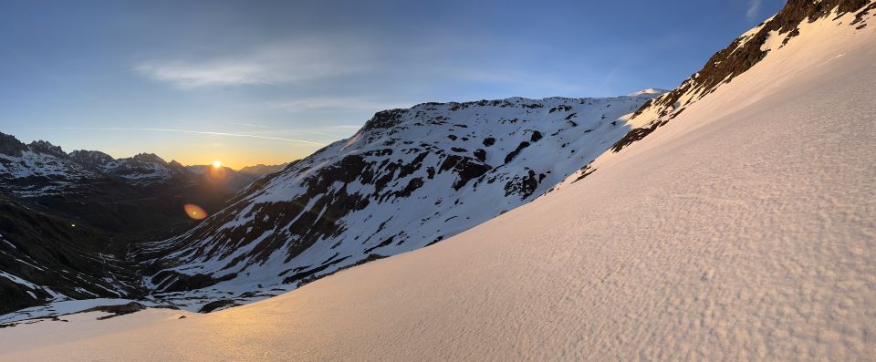 Schnee ab Furkapass bei 6 Grad und leichter Wind . Schneedecke bis Blaubergpass Osthänge Sulzten schon früh auf . Ab Blaubergpass zum Gross Muttenhorn schön Hart gefroren . Skidepots mit Steigeisen