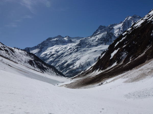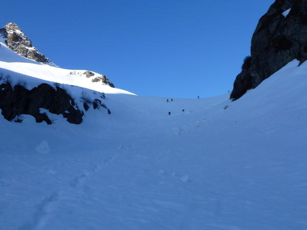 Wir trafen ideale Schnee und Wetter Verhältnisse auf der ganzen Tour an.Der Aufstieg machten wir durch die 1. Rinne empor, die sehr steil aber gut mit den Hasteisen zu machen war. Vom Skidepot auf den Sattel war heute ein Seil eingehängt, das sehr hilfreich im Aufstieg aber voralem im Abstieg ist.Der Gipfelgrat ist etwas felsig und ist gut zu machen, mit oder auch ohne Steigeisen.Auf dem Gipfel wehte ein kühler Wind um die Ohren.Die Abfahrt ist genial mit sehr schönem Schnee,wenn der rechte Zeitpunkt gewählt wird.