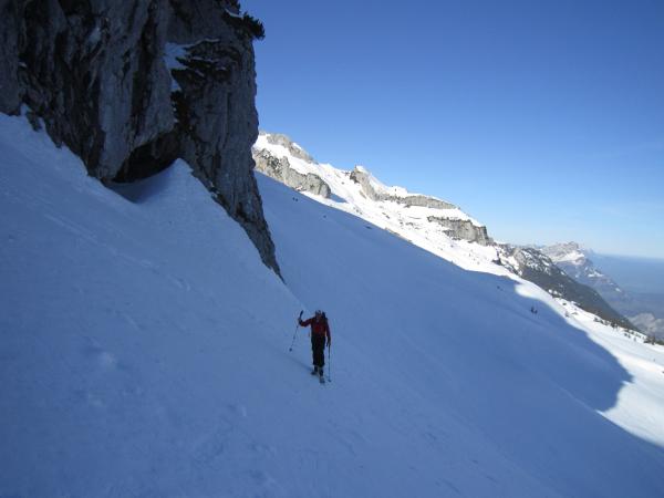 Wir haben das Schmal Stöckli östlich umgangen und sind dann der Route "Blüemälpli" gefolgt. Um 09:15 war alles noch halb-gefroren. Bei der Querung des Steilhanges vor dem Chaiserstock war ich froh um die Harscheisen. Beim Aufstieg durch den Felskamin haben mir die Steigeisen und der Pickel gute Dienste geleistet. Grundsätzlich Hartschnee bis auf eine Stelle mit Blankeis, die aber mit ein wenig Akrobatik via den Felssims links umgangen werden kann. Bei der Abfahrt um ca. 13:00 war immer noch alles halbgefroren, zum Teil leicht gefirnt, unten weich. Unten musste man beim Bach die Skis aufbinden und ein paar Schritte durch den sumpfigen Wald zu Fuss gehen.