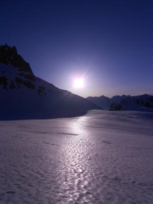 Die Sonne erreicht erst gegen 11.Uhr das Couloir und somit bleibt es lange so hart. Mit längerem Abwarten steigt jedoch auch die Lawinengefahr aus den Wänden des Winterstocks.