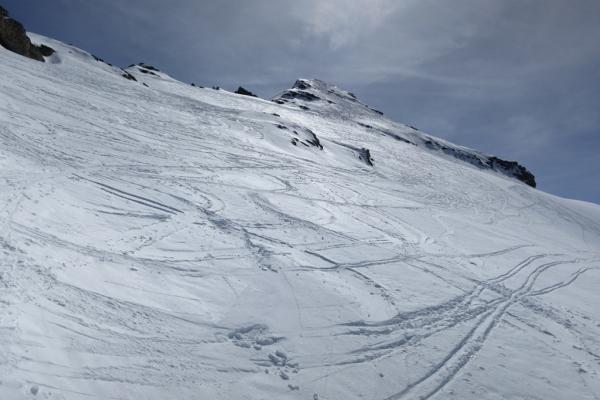 Abfahrt: 12:15 ab Gipfel, wenig Pulver in Gipfellinie, sonst Harschdeckel und Pressschnee.