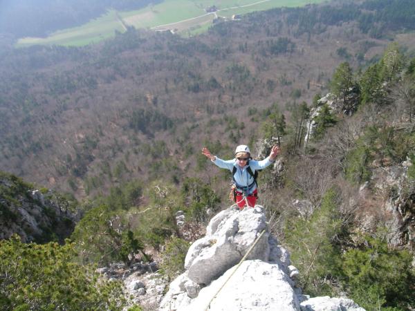 alles trocken, beste Verhältnisse, die Route ist in den schwierigen Stellen gut abgesichert. Der Kalk ist teilweise an den Schlüsselstellen glatt poliert. Der letzte Grat Aufschwung ( 2 Seillängen) zum Gipfel eher spärlich abgesichert. 3-4 Schlingen empfehlenswert, können gut an Bäumen und Sanduhren gesetzt werden.