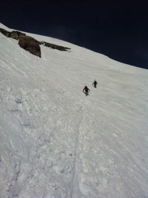 Sehr gute Verhältnisse: Morgens unten sehr Hart (unbedingt Harscheisen mitnehmen), dann ab ca 2200 m wenig Neuschnee, Gipfelhang gespurt bis zuoberst.
