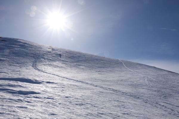 Geschlossene Schneedecke ab 1350. Zwischen ca. 1900 und 2200 Ski aufgebunden. Guter Trittschnee - Gräppeni waren nicht nötig. Pickel auch nicht