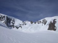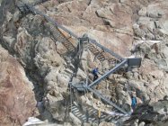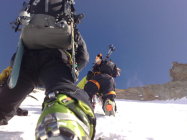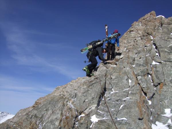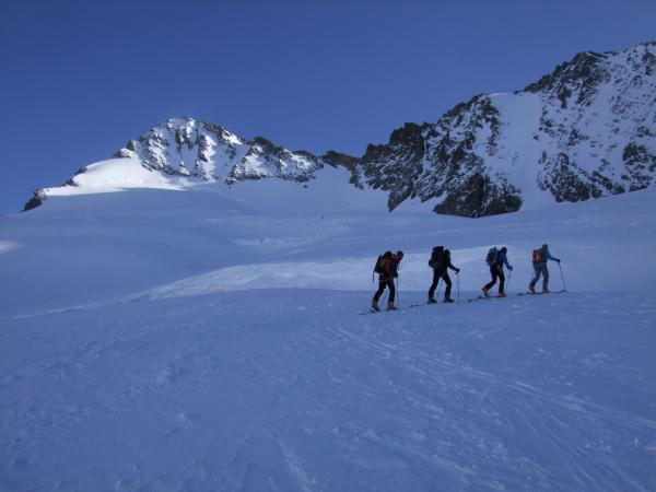 guter Trittschnee in der steilen Flanke vor dem Fischersattel, starker Wind daher schwieriger Schnee bei der Abfahrt