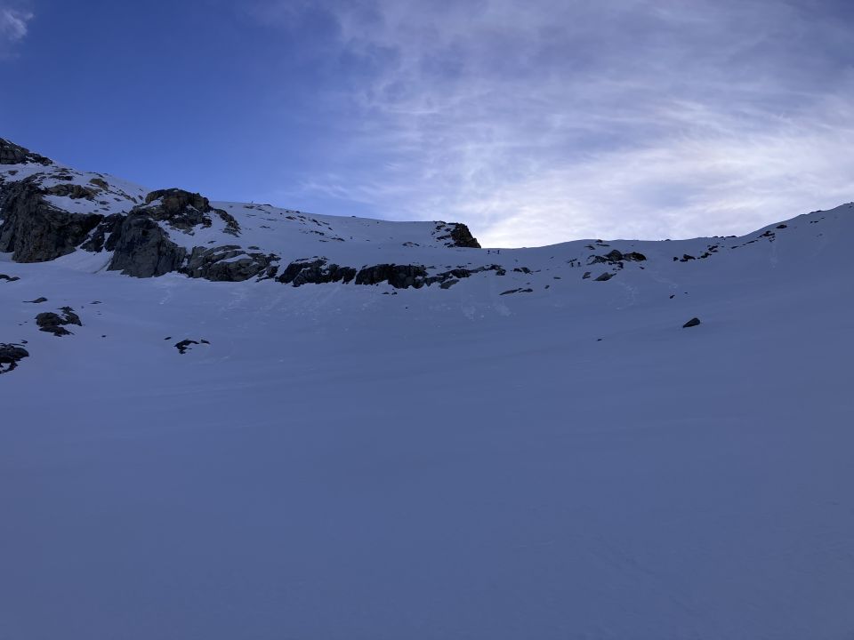 Wie immer morgens um halb fünf erst mal rechts um das Eisgrottenbuffet rumgeeiert, Weg zum Gletscher ok. Erst etwas mittig, dann rechts am Gletscher guter Schnee bis zum Abzweig. Ganzer Aufstieg mit Skis möglich, nach klarer Nacht ganzer Hang bretthart, Harsteisen definitiv Pflicht.