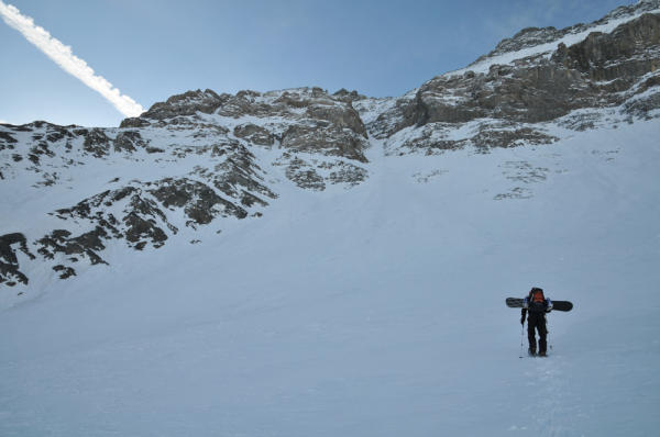 Im Couloir durchgehend Trittschnee und griffig bei der Abfahrt. Im oberen Drittel etwas härter und ruppiger als in den schön zu fahrenden unteren zwei Drittel.