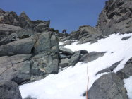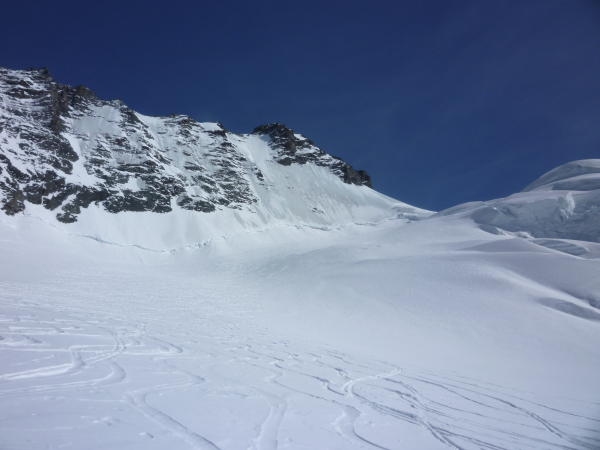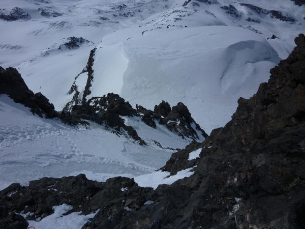 Schrund unterhalb Rimpfischsattel gut passierbar, Ski müssen kurz aufgebunden werden. Einstiegscouloir guter Trittschnee, Übergang erste Rippe/zweites Couloir (ca. 4140 m) hat Wassereis auf Felsplatte, m.E. z. Zt. heikelste Stelle, aber gut absicherbar. An eingen Stellen weiteres Blankeis/Wassereis, insgesamt aber gut