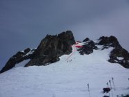 Wer auf den Gipfel möchte, muss das Couloir auf 4100 m nach links verlassen - das Couloir macht hier einen Knick (siehe Bild) und es findet sich eine Reepschnur im Felsen. Man folgt der ersten Rippe ca. 50 m (nicht Höhenmeter), umgeht einen Felssporn an einer plattigen Stufe (Wassereis) linksseitig, folgt der Rippe und quert entweder nach links über das Firnfeld zu einer deutlich sichtbaren Bandschlinge/Reepschnur (über Blankeis)oder hält sich etwas höher und quert in gutem Firn zu einer markanten Rinne.