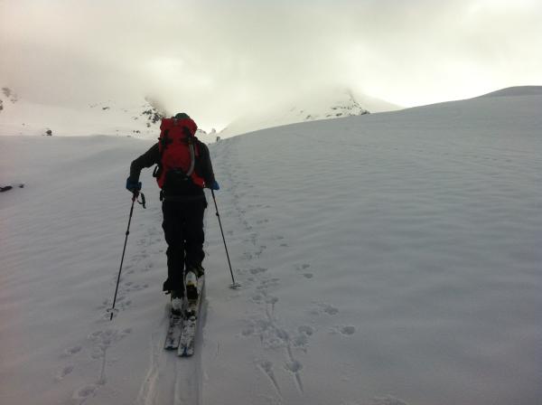 Wir haben heute den Aufstieg vom Pt. 1993 ostwärts durch die Mulden zur Messstation Pt. 2525 gewählt. In meinen Augen grenzwertig insbesondere die Steilstufe zwischen 2300 und 2400. Weiter oben bis zum Sattel Skitouring mit Höchstgenuss - traumhaft trotz eingeschränkter Sicht.