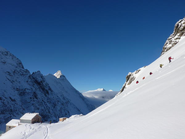 Vom Sattel der Abeni Flue teilweise gepresster Pulverschnee, von der Lötschenlücke schöner Pulverschnee bis zur grossen Tola, danach übergang in Sulzschnee, landschaftlich wie immer grandiose Abfahrt.