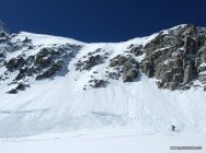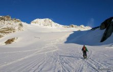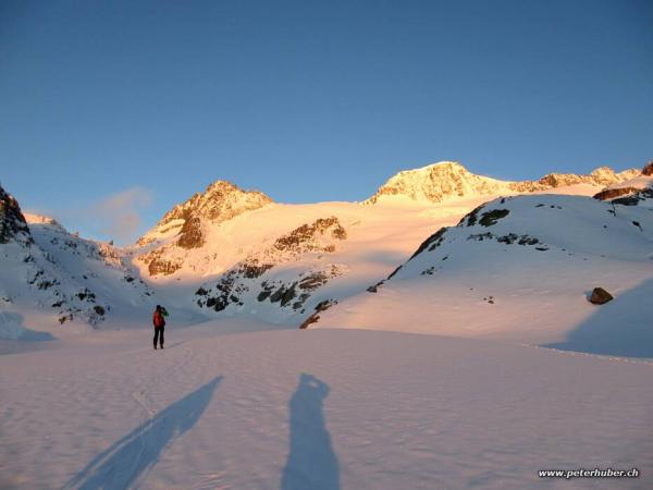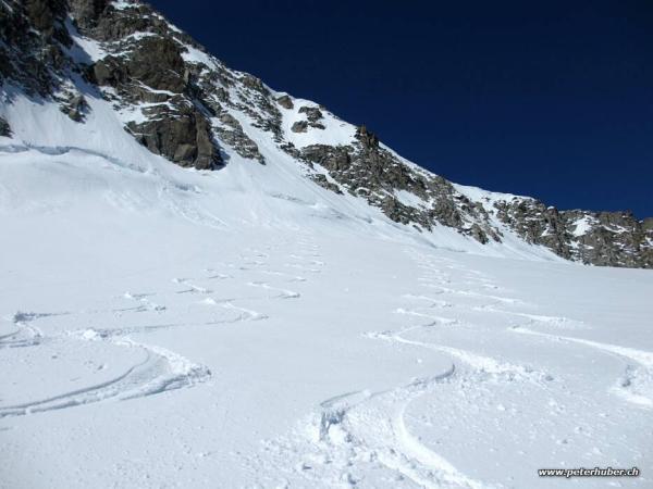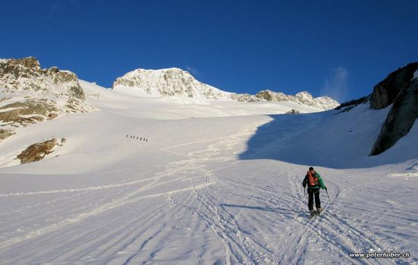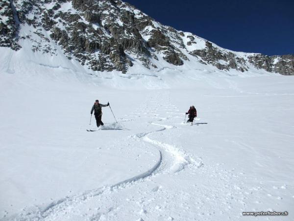 Gut tragender Schnee ab der Albert-Heim Hütte. Oberhalb ca. 2'800 m einige Zentimeter Neuschnee. Auf dem Gletscher sind die Seracs gut erkennbar. Daneben keine Spalten sichtbar - wir haben uns trotzdem angeseilt.