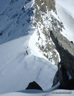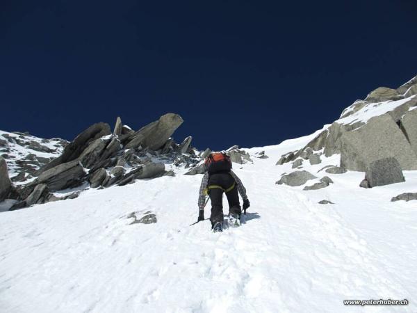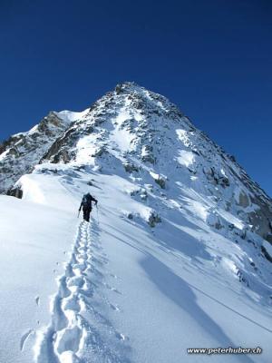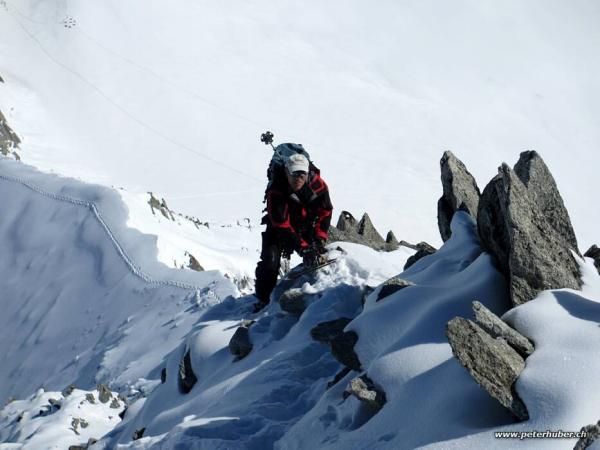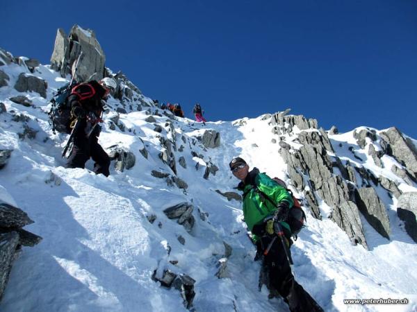 Mit gutem Trittschnee sind wir ab dem Skidepot ein Schneefeld direkt zu P3418 hochgestiegen (der normale Aufstieg auf den Grat wurde auch gemacht). Auf dem Nordgrat hat es ca. 10 - 20 cm Trittschnee, etwas pulverig, wurde mit und ohne Steigeisen bestiegen. Pickel empfehlenswert.