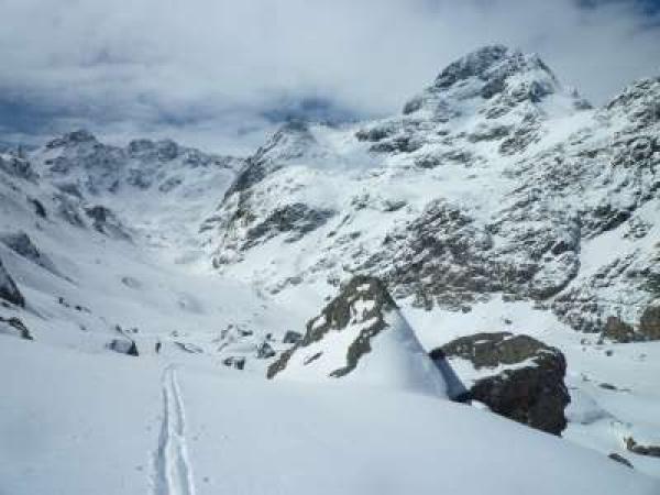 Der ab Mittag wehende starke Wind hat den Sulz ab 2200 mit einem Harschdeckel versehen, der uns bei der Abfahrt ärgerte.