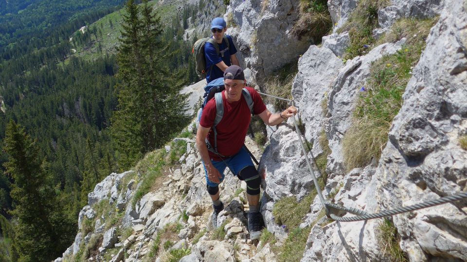 Wir starten am Parkplatz des Säulinghauses und nehmen bald den schattigen Fusspfad durch schönen Mischwald zum Säulinghaus hinauf (2 h). Das Haus ist offensichtlich bis auf Weiteres geschlossen. Der spannende Teil der Tour beginnt rasch hinter der Hütte. Die Stöcke wandern in den Rucksack und die Hände kommen immer mehr zum Einsatz. Schwierigere Passagen sind mit Seilen gesichert. Das abschüssige, oft abgespeckte und mit Geröll garnierte Gelände verlangt jedenfalls eine gute Trittsicherheit.