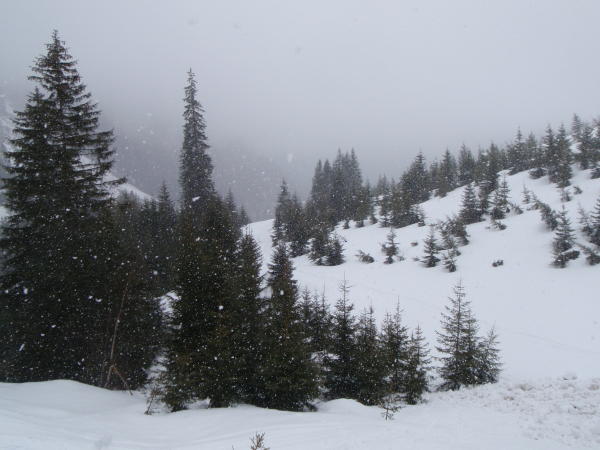 Da die Spur die aktuellen Niederschläge vermutlich nicht übersteht, ist es wahrscheinlich sinnvoll eine Setzung der Schneedecke abzuwarten. Die steilsten Schneeflanken gehen kurzzeitig bis ca. 70 Grad, dort muss man sich bei Pulver jeden Zentimeter hart erkämpfen.