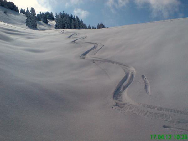 Noch sehr viel Schnee für Mitte April, obere Hälfte traumhafter Pulver, unten guter, etwas feuchter Neuschnee.