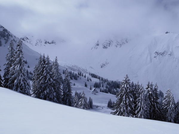 5-10 cm Neuschnee auf nicht ganz festem Altschnee, Pulver im oberen Teil, zunehmend pappig gegen unten. Alles gut zu fahren