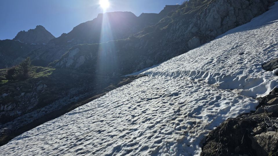 Bis zum Berghaus Tierwis kleine Schneefelder mit guter Trittspur. Ab ca. 2150m großes Schneefeld fast bis zur Himmelsleiter. Dieses linkshaltend aufsteigen, da mittig Steinschlaggefahr herrscht.