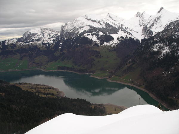 Die Skis müssen rund 20' getragen werden, bis P. 1090. Dann durchgehende Schneedecke. Anfangs kaum Neuschnee, ab der Traverse oberhalb Schlänggen zunehmend, auf Alp Fluebrig (1588 m) ca. 10 cm, bis ganz oben 15 bis 20 cm, angenehm zum Spuren. Leiter und Ketten sind frei, auf dem Grat zum Gipfel hat es wenig Neuschnee.