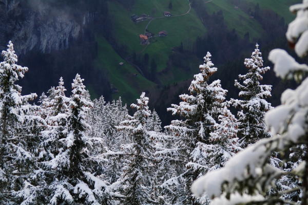 Ca. 10cm Neuschnee in Sulwald und ca. 25cm auf 2500 m. Dank des bewölkten Wetters blieb der Schnee auch bei der Abfahrt pulvrig bis ca. 1800m. Es hat noch viel Schnee. Von der Sulwaldbahn Bergstation müssen die Skis nur etwa 400m bis zum Waldrand getragen werden.