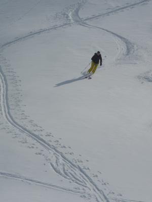 Abfahrt N-Culi Pulfer satt,N-Flanke 20cm. auf griffig,der Rest in Mulden schöner Pulfer bis unten ,immer etws schwerer werdend,aber super top.Laweiculis sahen uns dann doch etwas zu arg eingeblasen aus zum Anhängen.Retour Chare begans auch schon wieder zu schneien.