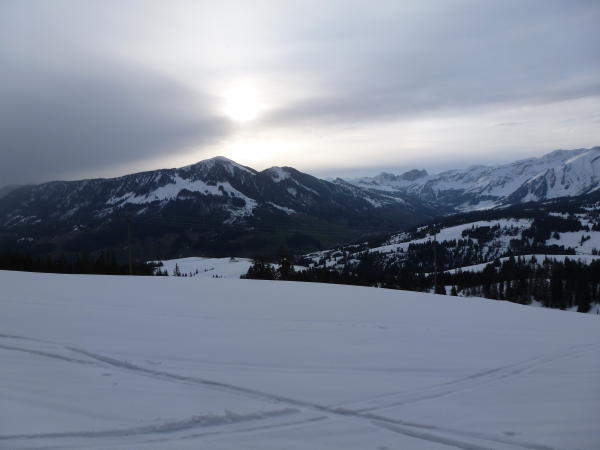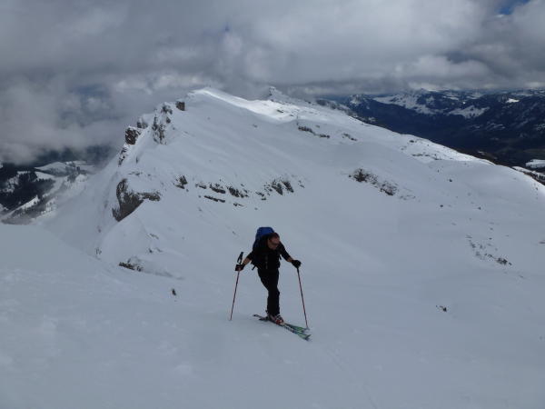 Da Wetter wieder besser, nochmals angefellt und Richtung Schibengütsch. Nun Wetter sehr schnell wechselnd aber mehrheitlich gut bis sehr gut. Schnee in der Abfahrt vom Gipfel = schwerer Pulver. Weiter unten (Ober Ruchweid) dann leicht angesulzt.