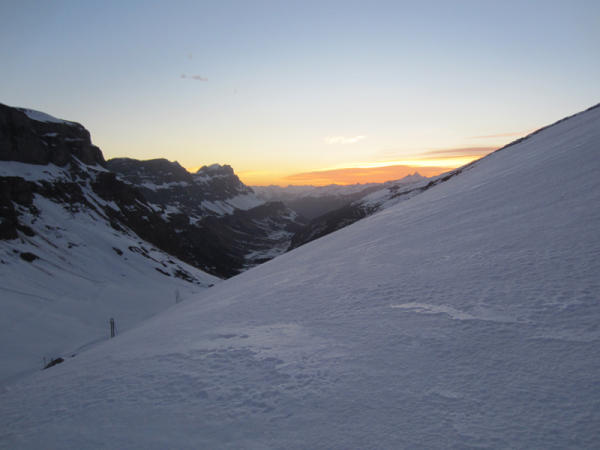 Sulz noch erstaunlich gut zum fahren (obwohl nicht gefroren Übernacht). Im Mittelteil, noch ein bisschen eingesoffen, im unteren Teil hat der Schnee sich in den letzten Tagen aber schon gut gesetzt.