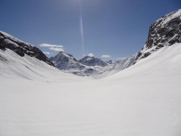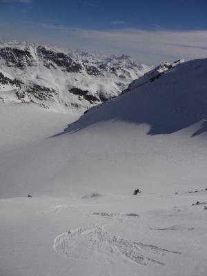 Sur bis Alp Flix dank Pistenpullyspur auch bei diesen Temperaturen ok.Ab alp Flix bis 2400m sehr weich.Ab P.2741 nur noch mit Harscheisen bis auf den Piz d'Agnel.Tschima da Flix ohne Eisen (9.00).Vadret Calderas zuerst Pulver,dann Windgepresst,übelster Bruchharscht und zum Schluss Sulz.Abfahrt Piz d'Err in etwa das gleiche.