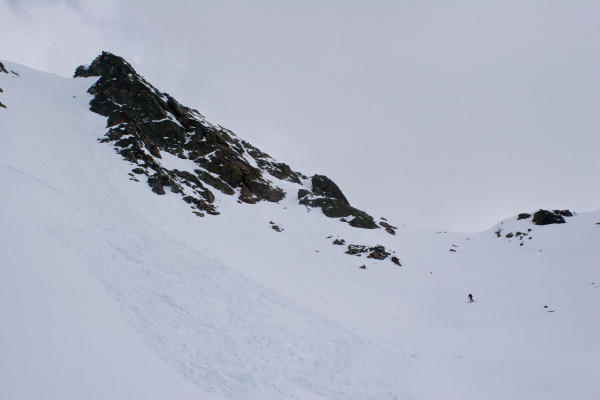 Abfahrt: Kein Auffirnen, jedoch gut griffig vom Gipfel an. Im mittleren Teil echter Haxenbrecherschnee vom Feinsten. Im unteren Teil schöner weicher Frühjahrsschnee zum Zöpfle flechten.