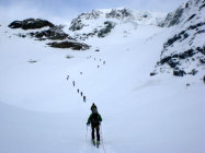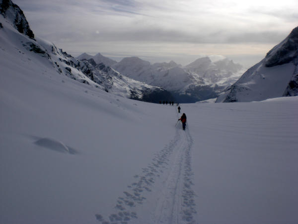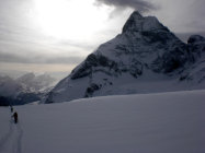 Nach Neuschneefall bis zu 30 cm Powder. Insgesamt sehr gut eingeschneite Gletscher. Der Südföhn war lästig und brachte nach dem sternklaren Morgen schnell die Wolken zurück.
