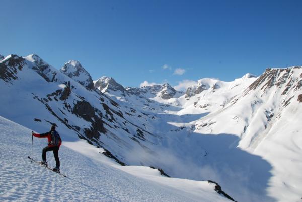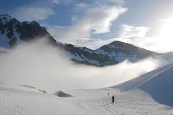 Im Aufstieg zu früher Stunde empfehlen sich Harscheisen, kürzere Tragepassagen am Sommerweg, Abfahrt bei firnigen bis sulzigen Verhältnissen