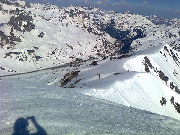 Schnee gut durchgefroren. Nur im oberen Bereich glatte Hänge für schönen Firn. Abfahrt um ca. 10:00. Wir entschieden uns für eine Abfahrt ins Pazüeltal. Für die normale Abfahrt zum Flexenpass (westseitig) war es noch zu früh. Die ostseitige Abfahrt ins Pazüeltal war wiederum schon fast zu spät. Landschaftlich dafür sehr lohnend. Gesehen haben wir 9 Birkhühner, einige Murmeltiere und 4 Gormley-Figuren.