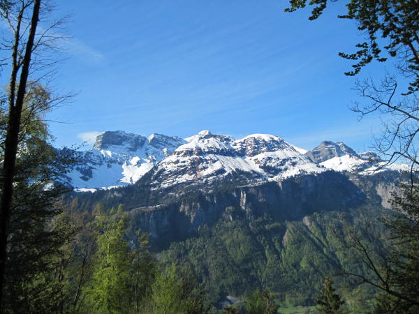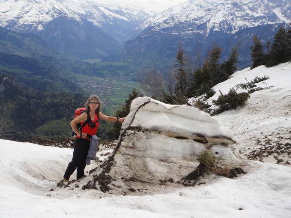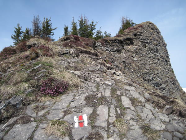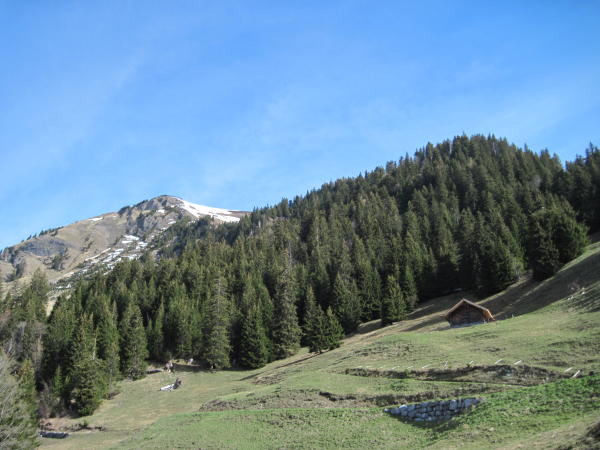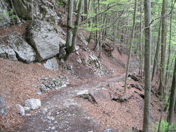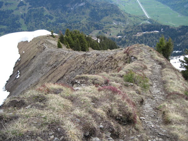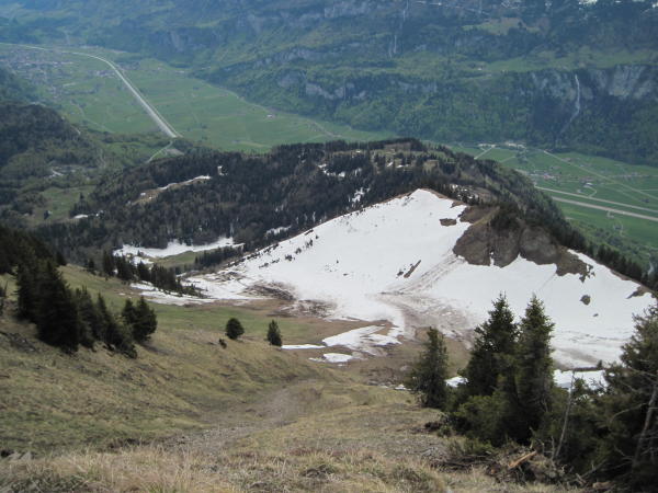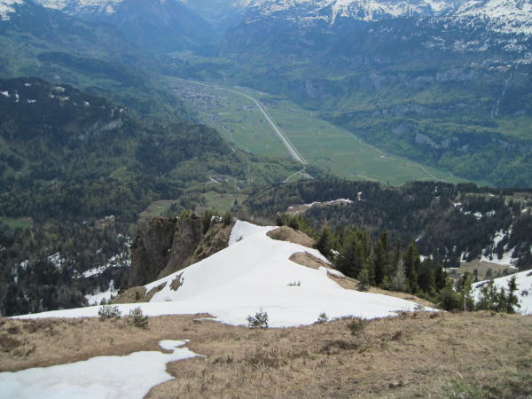 Wege meist gut markiert und trocken, praktisch schneefrei bis P 1573. Ab hier muss ein riesiger Lawinenkegel überschritten und ein Erdrutsch überquert werden. Am Südhang steht jetzt wieder eine weiss-rote Markierungsstange, ab dort zu P 1825. Der Pfad im Wäldchen ist nicht durchgehend begangbar. Schneemassen fordern kurze südseitige Umgehungen im steilen, plattgedrückten Trockengras (rutschig). Die überschrittenen Schneefelder waren guttrittig.