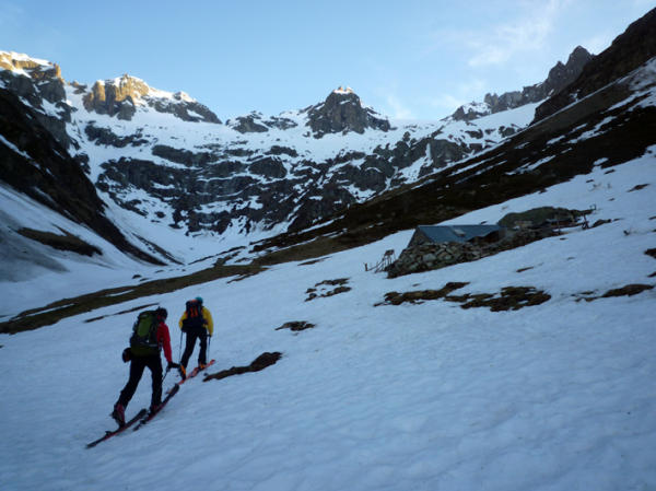 Stotzige Abfahrt ab tiefstem Punkt vom Grat (grün auf dem Foto). Wunderbar weite Schwünge Rossfirn – Juzfad - Rossplangg.