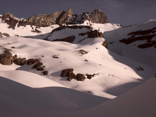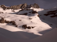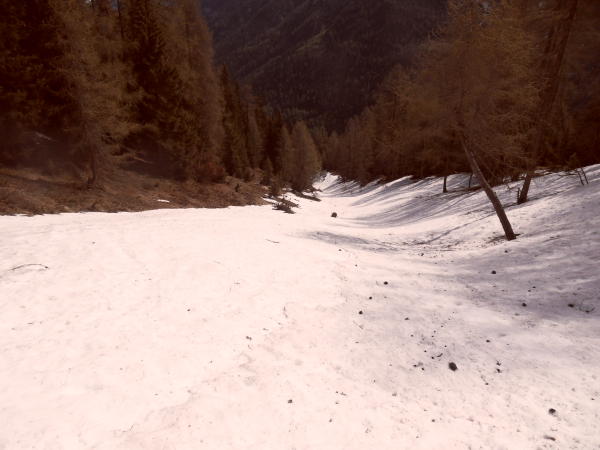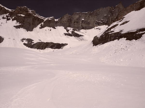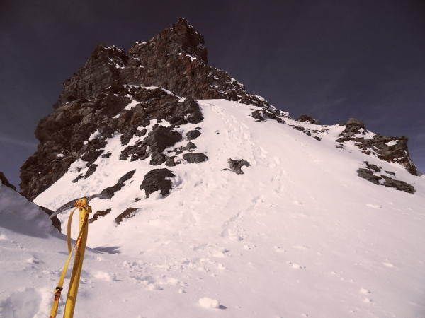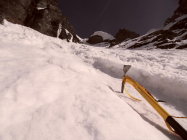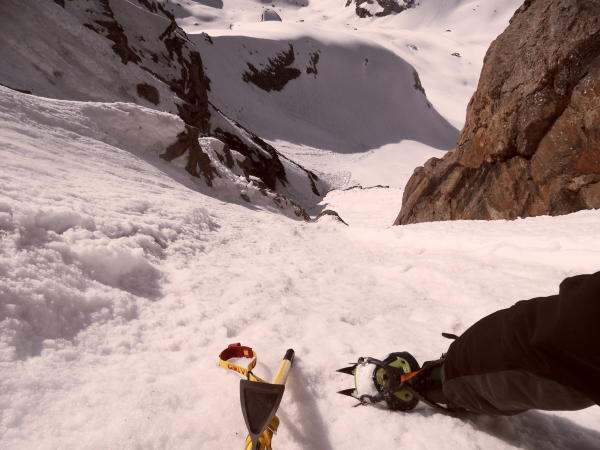 Zeitig starten, bin um 9.00 vom Gipfel runter. Das Couloir wird lebendig, Helm nicht vergessen!