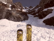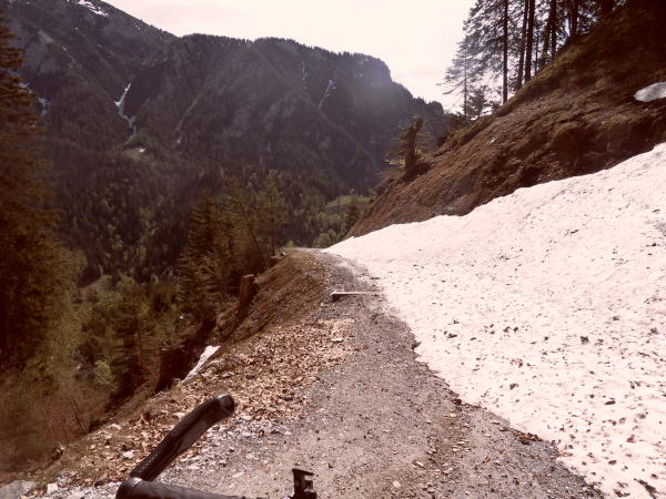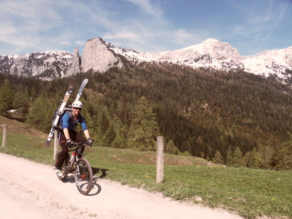 Mit dem Bike bis Wasserbergtobel 1480, trocken und schneefrei. Nun auf gesetztem Altschnee bis Sandböden und auf tragendem Firn zum Skidepot. Mit Steigeisen auf meist hartem Schnee zum Grat. Gipfelfelsen trocken und Schneefrei.