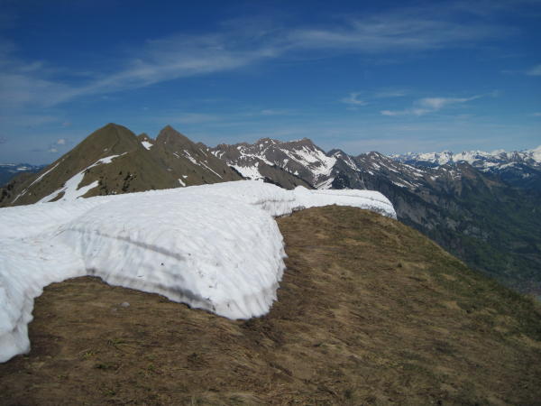 Unterhalb der Ällgäuwlicka ist ein sumpfiger Erdrutsch zu queren sowie steile Altschneefelder. Ein Ausrutschen wäre fatal. Eisen oder Pickel dienlich, falls noch gefroren. Allenfalls bergseitig den Schnee umgehen (rutschiges Trockengras und ebenfalls steil). Die anschliessende Überschreitung völlig problemlos. Ein kleines Schneefeld am Anstieg zum Gummhoren nicht störend. Einiges an Fallholz im Abstieg oberhalb Biel 1170 m.
