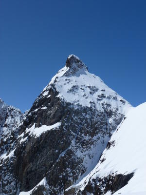 Am Gipfelaufschwung bis zum Beginn der Traverse ins Couloir eine Spur vorhanden. Haben danach neu gespurt. Meist guter Trittschnee, ab und zu kommt man jedoch auf die Felsen durch. Seilsicherung empfehlenswert. Gerade am Beginn der Traverse kann an einem grossen Block eine Stand-Sanduhr eingerichtet werden. Dann nach der Traverse ein fixes Reepschnürli für eine Zwischensicherung. Vom Sanduhr-Stand kann man genau 30 m ausgehen und erreicht dort auf der rechten Couloirseite einen soliden Block für einen Standplatz. Vorher bietet sich nichts gescheites an. Die Bohrhaken sind alle eingeschneit.