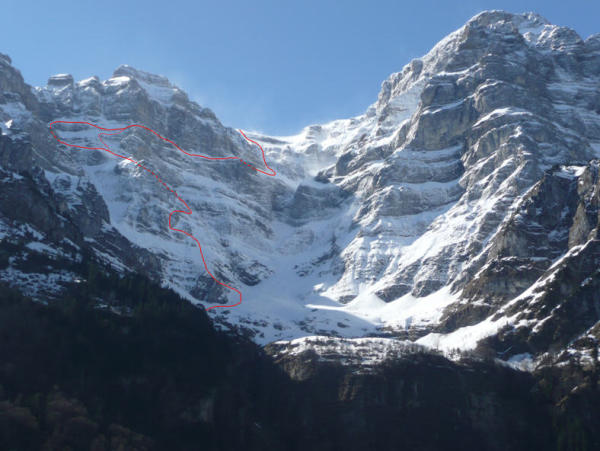 Vom Chalttälifirn (Auslauf der Rutsche aus dem grossen Kessel) erst mögliches Band links auf den steilen Grasrücken nehmen. Bis zum Chnoren gefrorener Boden (Gras, Schotter, Fels) mit einigen Restschneefeldern (es gibt verschiedene Wege auf den Chnoren - mein Weg ist im Hauptbild eingezeichnet). Von Chnoren bis erstes Couloir beinahe duchgehende Schneedecke (eine kleine Felsstelle zu überwinden)