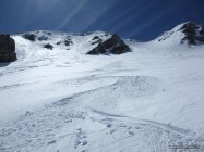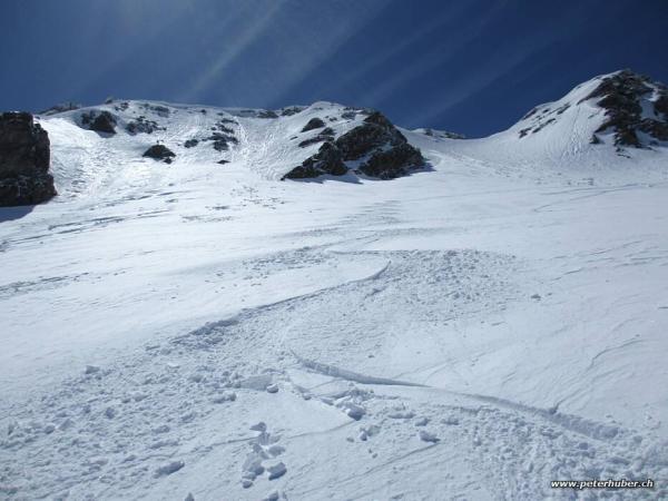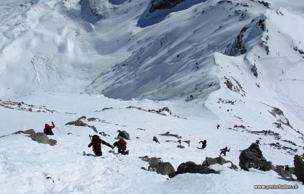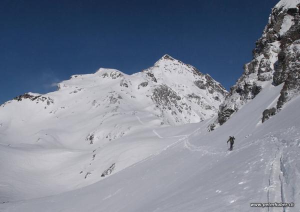 Super schön, zeitweise giftig kalter Wind. Es hat ca. 10 cm Neuschnee gegeben. Nur ist er leider verweht - in den Mulden toll, daneben hart mit etlichen alten Spuren. Harscheisen im oberen Teil hilfreich. Es hat genug Schnee auf der ganzen Strecke. Skidepot auf ca. 3'100 m. Harter Trittschnee - es geht auch ohne Steigeisen (angenehmer mit Steigeisen und Pickel).
