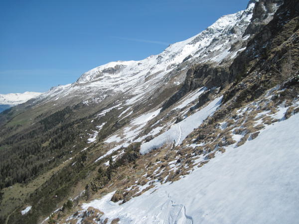 Oberhalb hatte es einigen Pulver gegeben, der auch heute in der Abfahrt noch gut zu fahren war. Bishorn relativ verblasen, Pulverstrecken unterhalb 3600 m waren schön zu fahren.