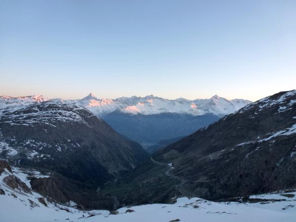 Start beim Hotel Simplon-Kulm (2005 m). Zwei kurze Tragstrecken, die bei der Abfahrt durch bessere Routenwahl vermieden werden konnten. Nach klarer und sehr kalter Nacht vom Start bis zum Skidepot pickelhart gefrorener Schnee. Vom Skidepot Aufstieg mit Steigeisen und Pickel in viel und gutem Trittschnee, der alle Felskletterei unnötig machte (trotzdem natürlich einige ausgesetzte Passagen aufweist). Bei der Abfahrt in den schönen Steilhängen unter dem Breithornpass Schnee leicht aufgesulzt; in den Mulden auch bis ca. 10 cm, zum Teil schon feuchter Triebschnee.