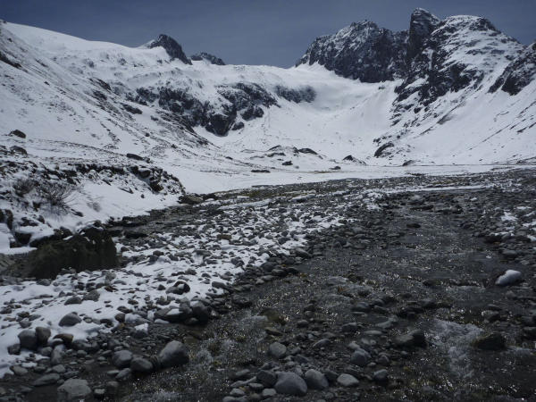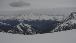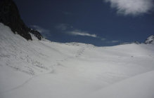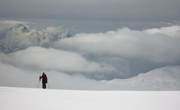 Gipfelaufstieg problemlos, auf gutem überwiegend festen Schnee, teils etwas frisch pulvrig. Weder Steigeisen noch Pickel benötigt, auch kein Seil auf dem Gletscher.