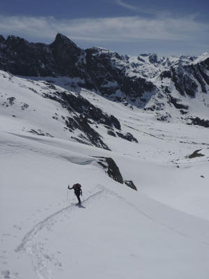 Abfahrt ins Val la Buora, nach 100m Gegenanstieg auf dem Gl. da Medel, westlich des Grates Davos la Buora, sehr schön, Firn, unten dann Matsch (Mittag) bis auf 1850m, kurz oberhalb der Brücke 1815m. Zu Fuss nach Fuorn, bequemer Waldweg.