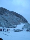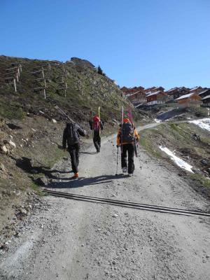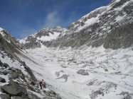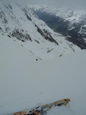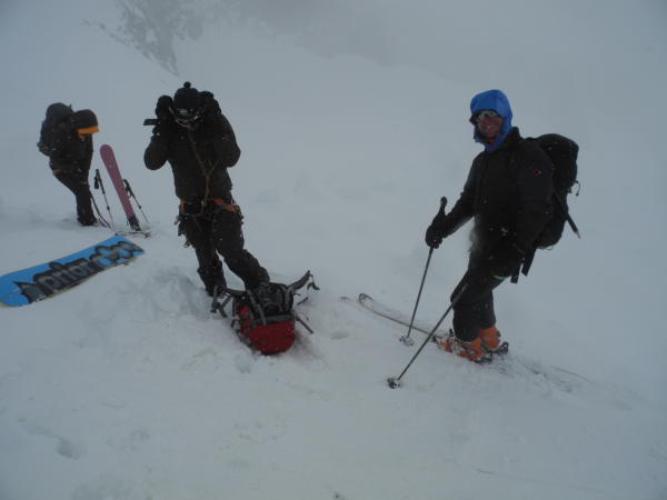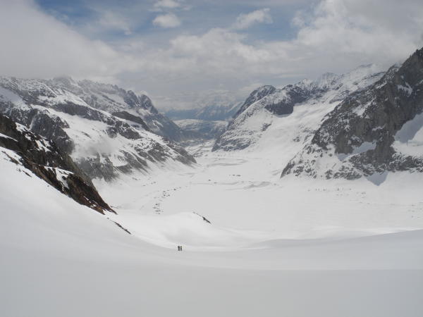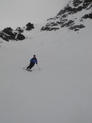 Kurz vor 6.00 Start und Aufstieg Gletscher Schinhorn bei bescheidenem Wetter und kaum Abstrahlung,ab Gletschermitte mit Seil ratsam.Abbruch bei Skidepot weil Wetterverschlechterung,Nullsicht,Neuschnee von Vortagen als Harstdeckel kein Genussabfahrt vom Gipfel versprach(was ja unser Ziel war) und man auch spätestens 12.00 im Beichpass sein sollte).Kurz Abfahrt über Gletscher Bruchharst,unten schön und hochbleibend über den Felsbänder alles rausquerend(ca. 3000hm)Richtung Beichpass:tip top,alles fahrbar, Felsbänder noch eingeschneit.Beichpass gut zu Spuren.Abfahrt direkt(gut 40°/Felsdurchsetzt,stürzen schlecht),linksbleibend noch gute Durchschlüpfe,Restabfahrt durch die Megabobbahn Supersülzli bis Surfplütter sehr gut(kommt recht gut an den Lauizügen vorbei),geht knapp bis Faflere mit Schnee.