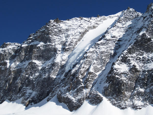 Die Schwierigkeiten beschränken sich auf die ersten 20 - 30 m (75 - 80°), danach in leichtem Eis und weiter oben Trittfirn zum Gipfel. Der Abstieg ist nicht zu unterschätzen...