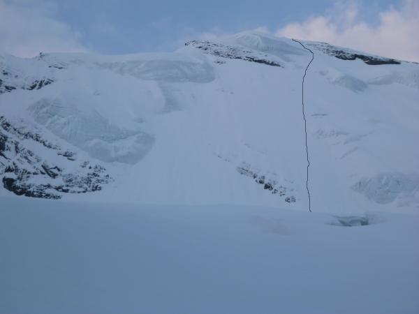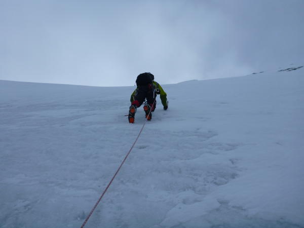 Die Wand selbst ist in einem sehr guten, wenn nicht idealen Zustand. Bis unter den Serac guter Trittschnee, dann für ca. 200m kompaktes und sehr gut zu begehendes Eis.